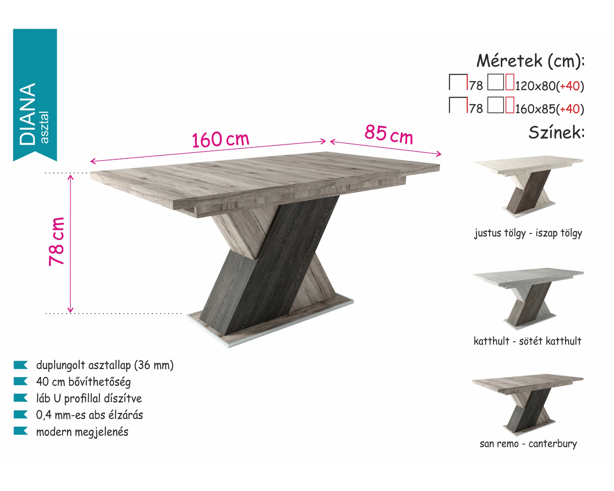 A 3 színkombinációban kapható Diana asztal az Ön étkezőjét is különlegessé teheti: justus tölgy-iszap tölgy, katthult-sötét katthult, san remo-canterbury színösszeállításaihoz egyaránt jól mutat a világos vagy sötét színű étkezőszék. 120 és 160 cm-es méretben kapható, amelyek 40 cm-es vendéglappal bővíthetőek.