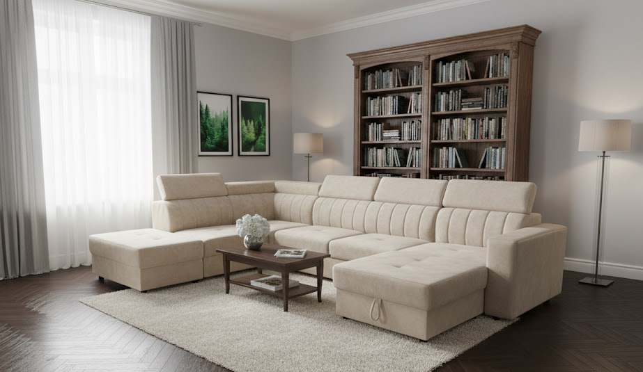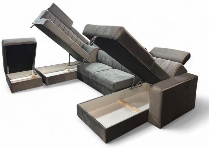 • A hosszabb 230 cm-s részén egy felnyitható tetejű, tárolós puff van összeakasztva a kanapéval, ami igény szerint levehető róla