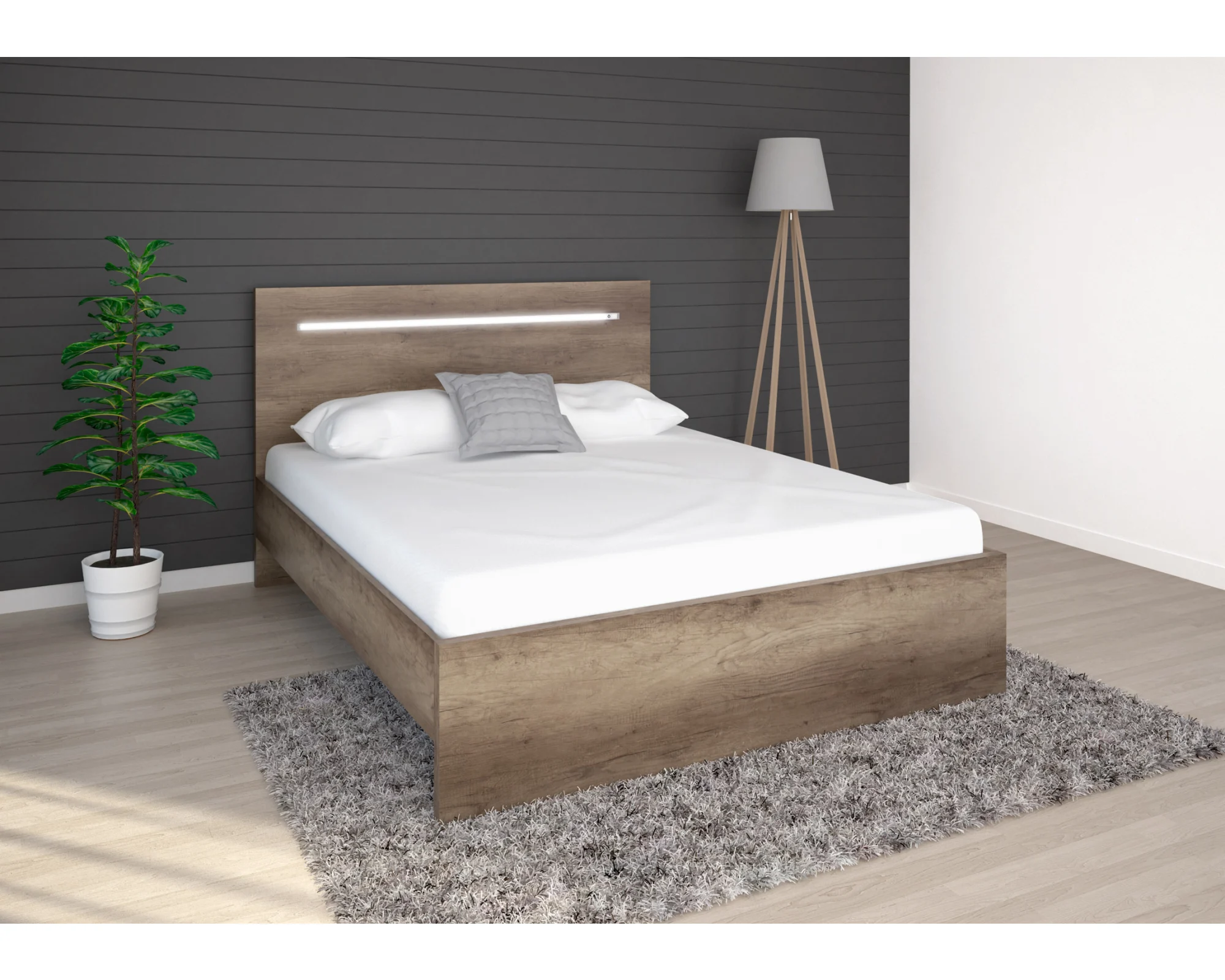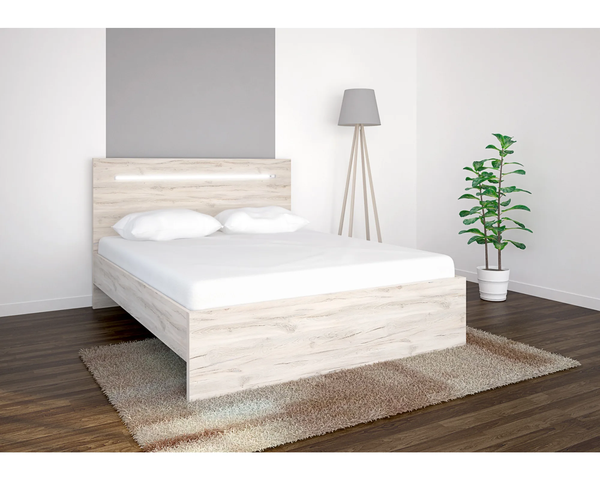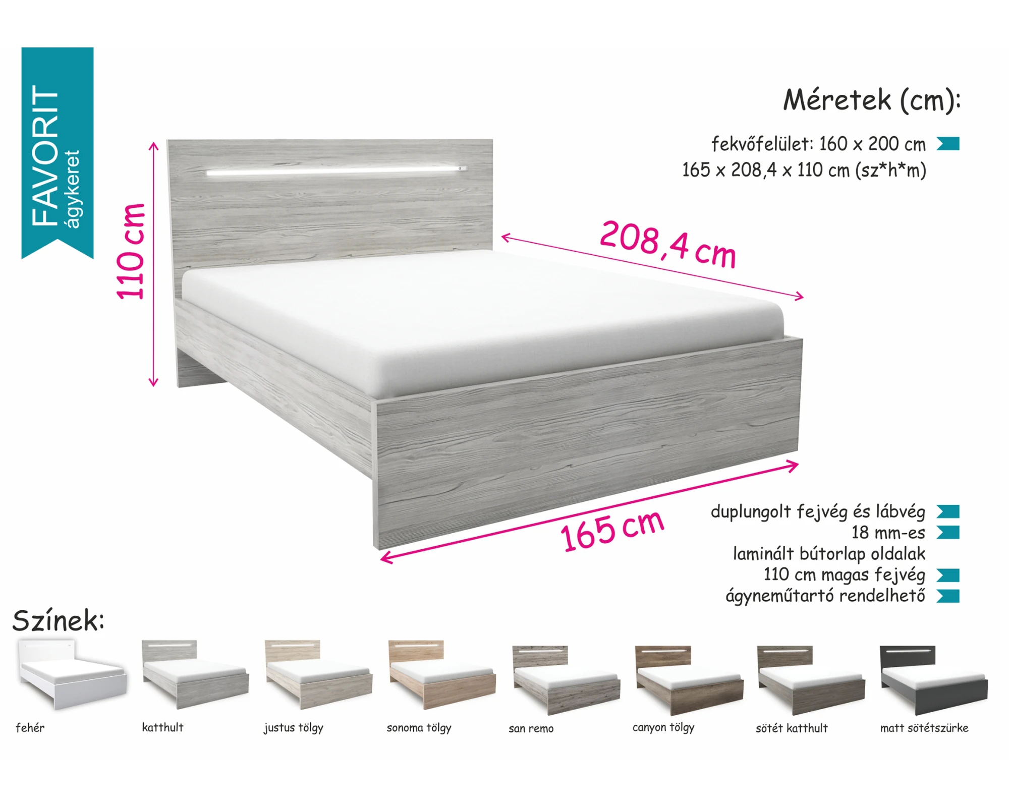 A Favorit ágykeret fejtámlájában beépített érintőkapcsolós LED világítás található. 18 mm-es laminált bútorlap oldalakkal, duplungolt fej- és lábvéggel készült. Rendkívül nagy színválasztékának köszönhetően könnyedén található a hálószoba berendezéséhez illő darab. Opcionálisan ágyneműtartó rendelhető.