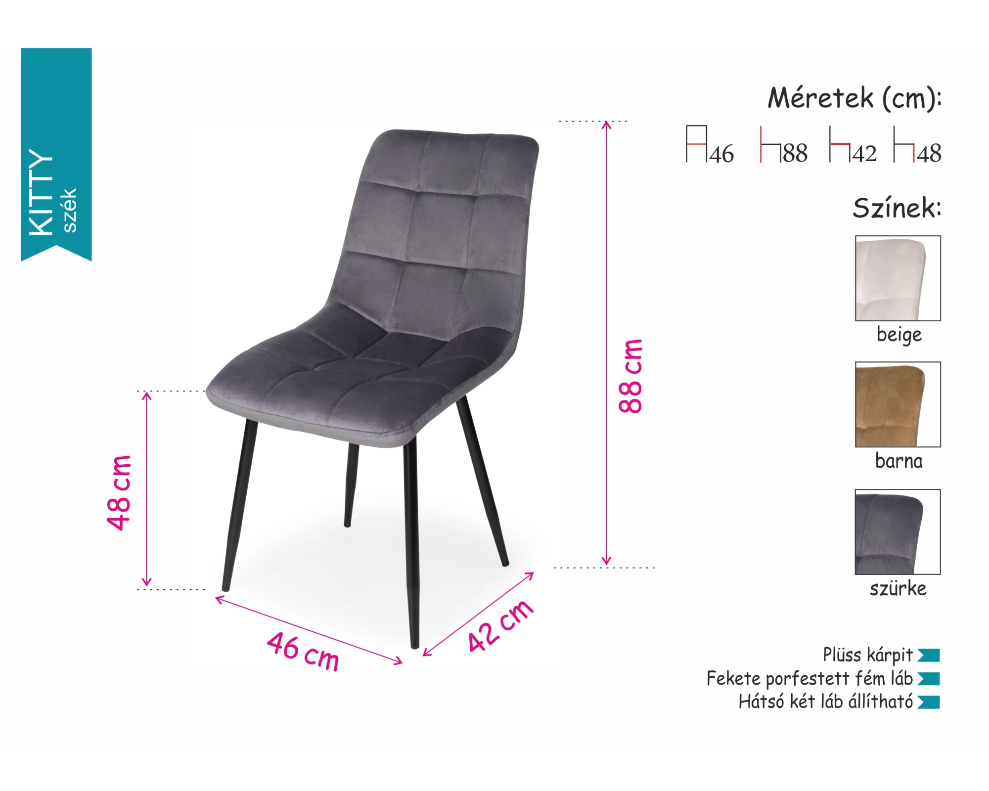 A Kitty szék 3 különböző színben, plüss kárpittal, fekete porfestett fém lábbal kapható. A szék hátsó két lába állítható.