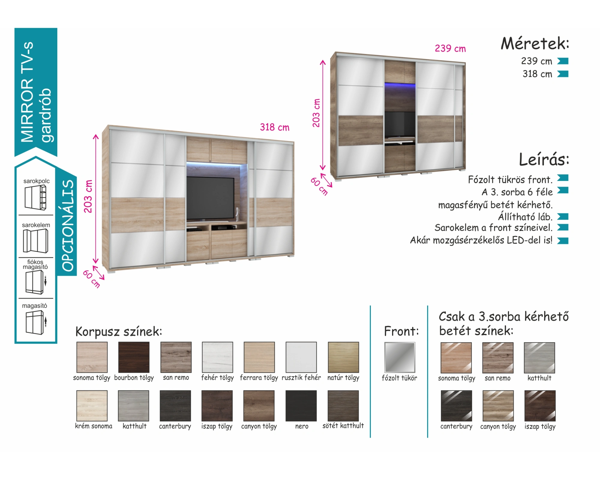 239 cm és 318 cm-es méretben kapható. 14 szín közül lehet választani a korpusz esetében, illetve a fózolt tükrös fronthoz 6 magasfényű betétszín közül lehet válogatni ami a front 3. sorába kérhető.