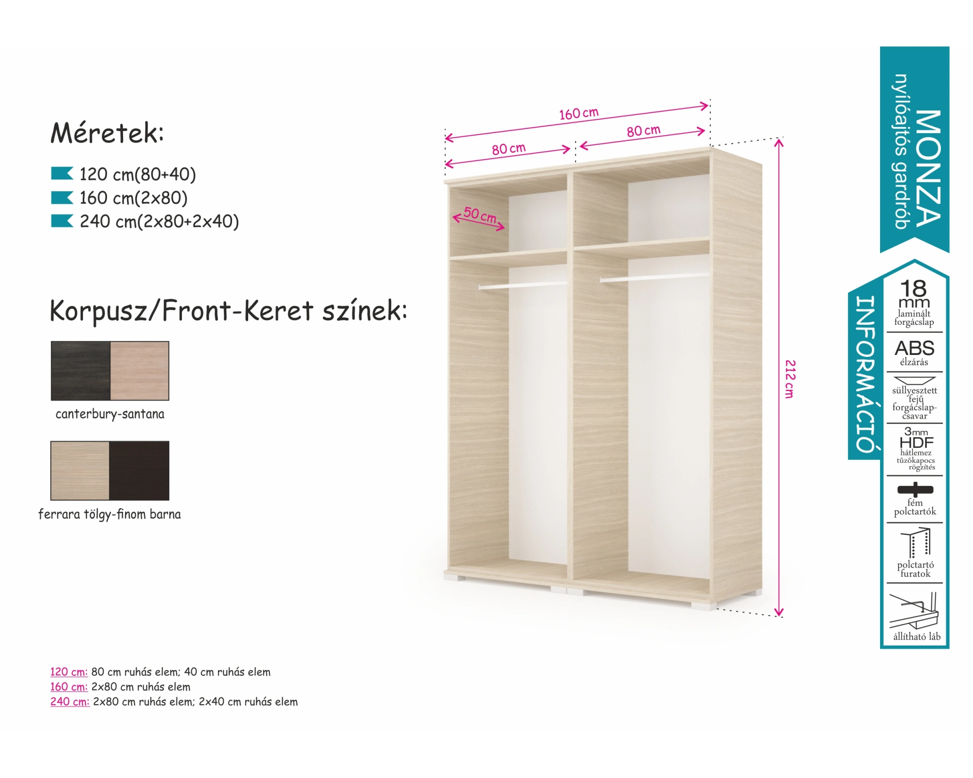 Klasszikus megjelenésű nyílóajtós Monza gardróbunk canterbury-santana és ferrara tölgy-finom barna színösszeállításban kapható. 3 méretben: 120, 160 és 240 cm-es változatban érhető el, így bármely méretű hálószobába megfelelő választás lehet. A letisztult vonalvezetést a tükörbetét még kifinomultabbá teszi.