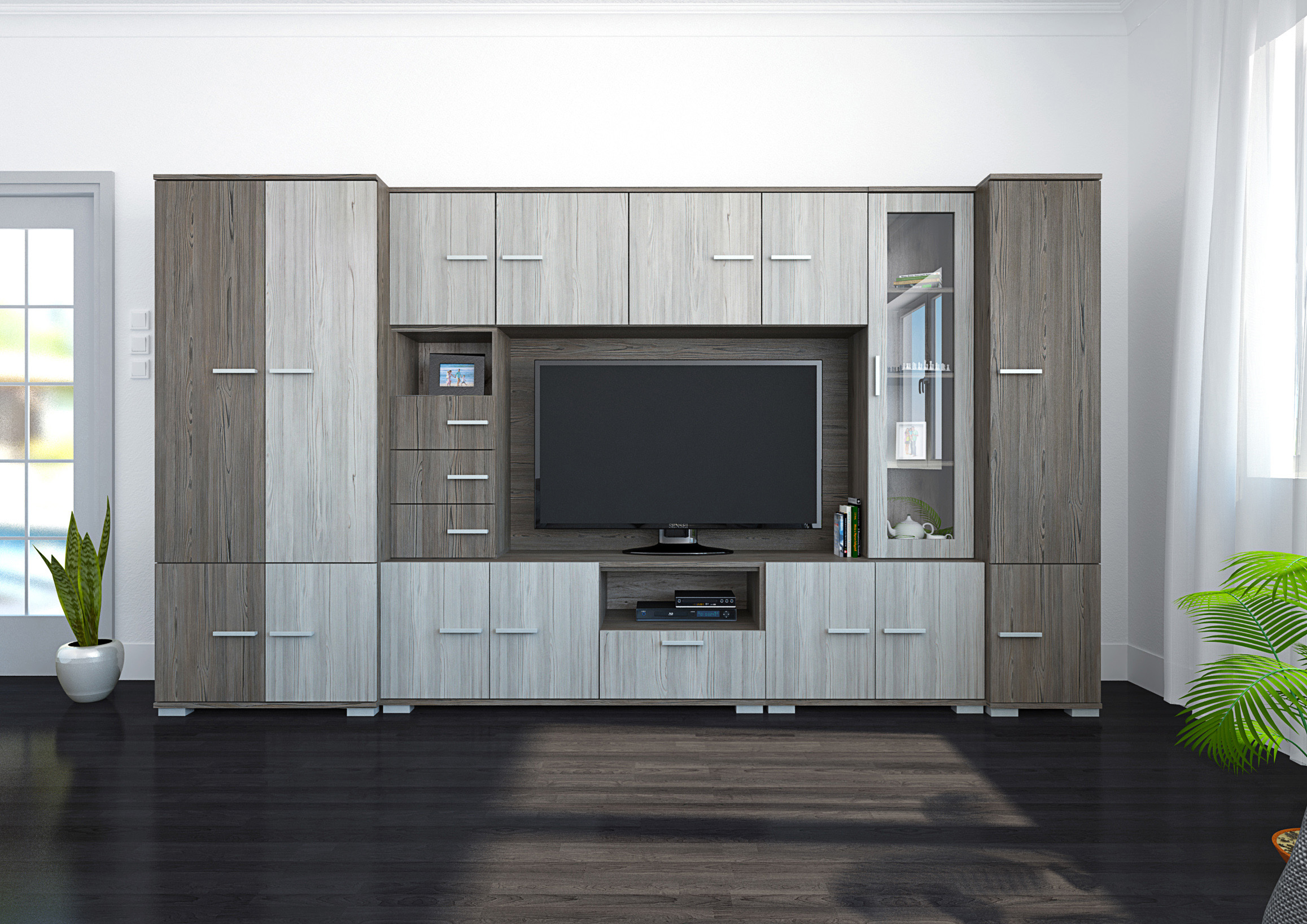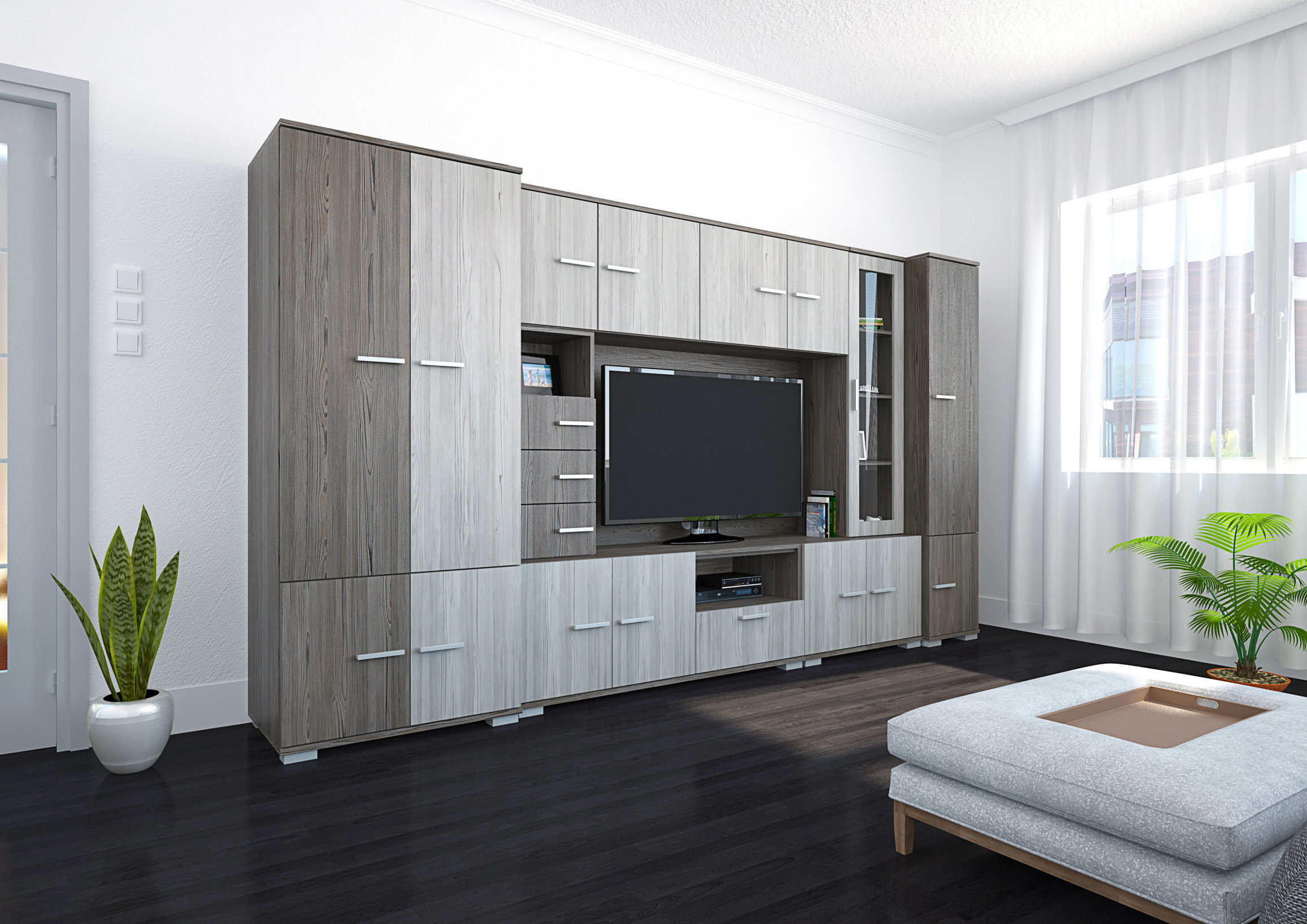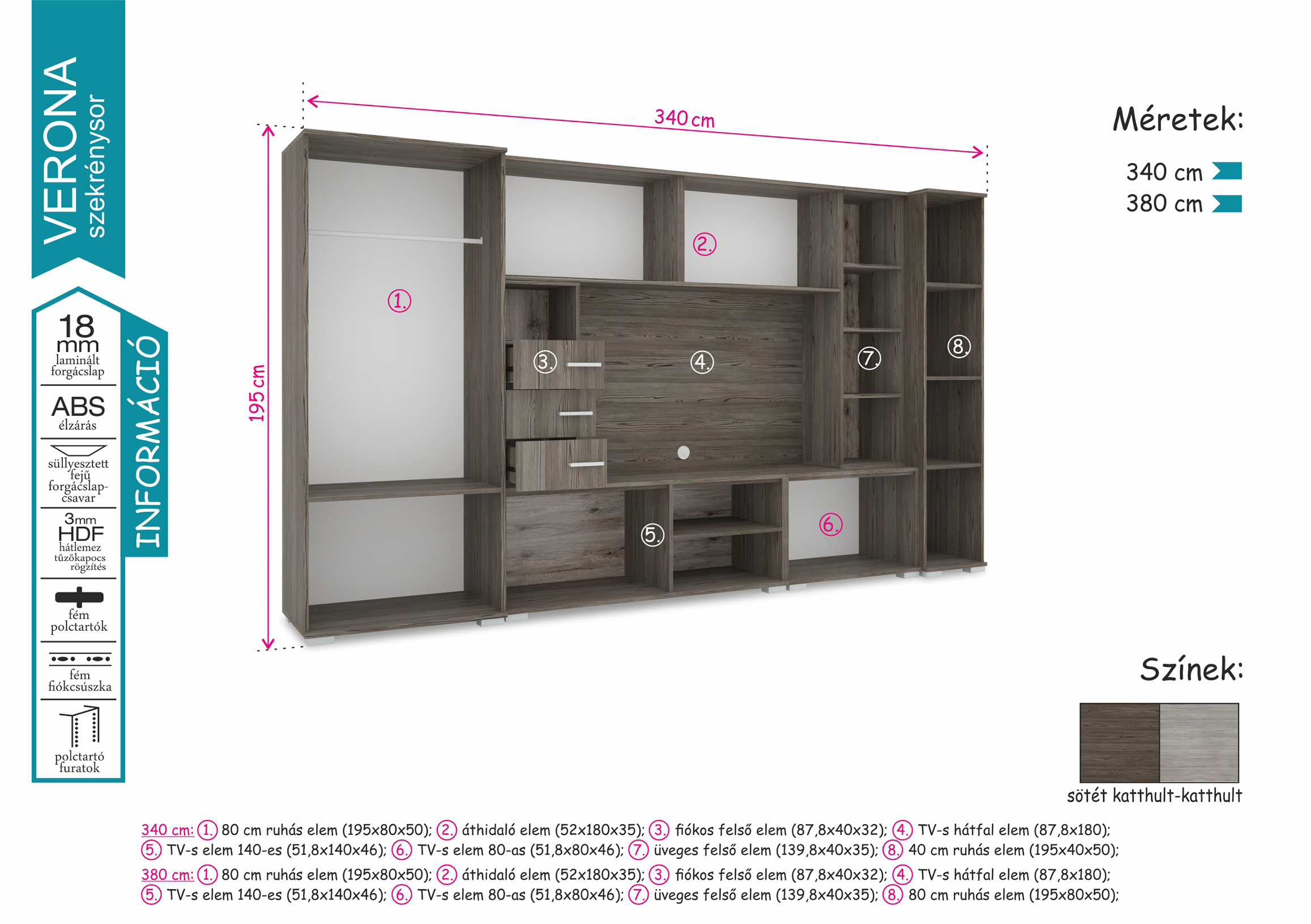 A Verona szekrénysor megjelenésével számos nappali éke lehet. Két méretben érhető el, 340 és 380 cm-es kivitelben. Sötét katthult és katthult színeivel harmónikus összhangot teremt bármely helyiségben. Nagyon jól pakolható, jól tervezett belső tereiben mindennek meglesz a megfelelő helye.