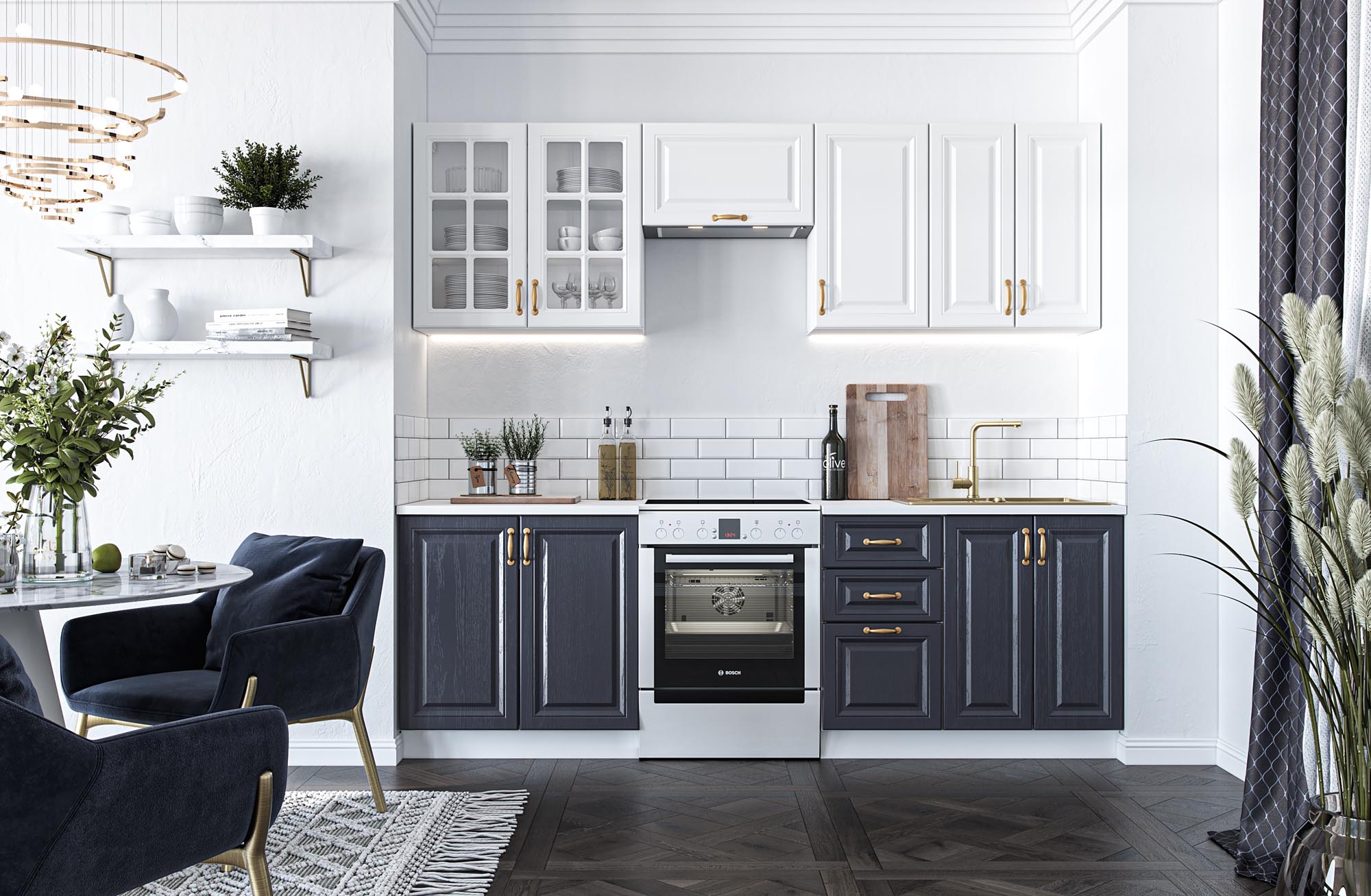 szett hossza: 240 cm, gázemelők, munkalap vast. 28 mm, MDF előlapok, szín: előlap – fehér / sötétkék, test – fehér, munkalap – fehér