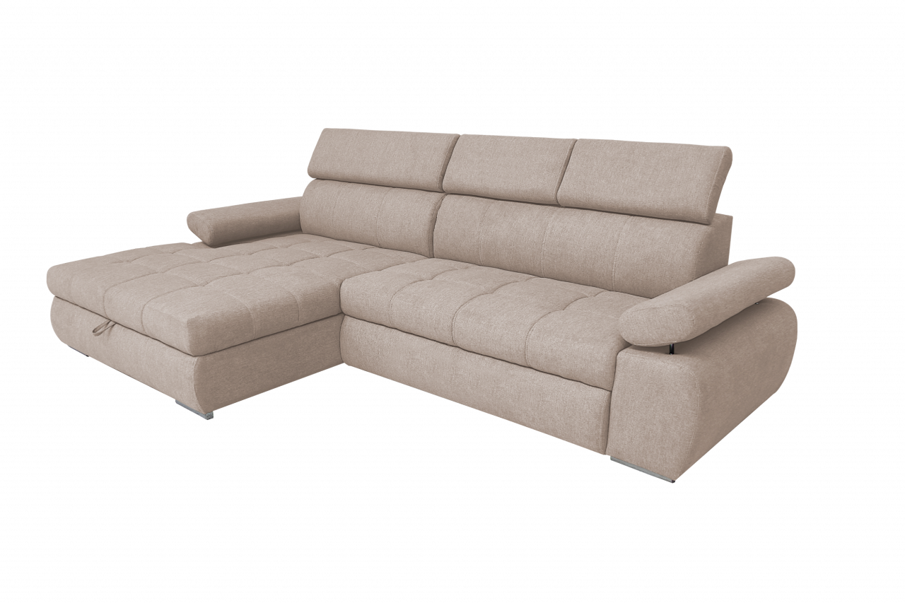 magas fekhelyes, jobbos-balos állásban rendelhető, hátulja szövettel bevonva, kiemelő mechanika, hullámrugós, szövet, ágyazható, ágyneműtartós, állítható fejtámla, állítható kartámla, 250 – 300 cm szélesség között